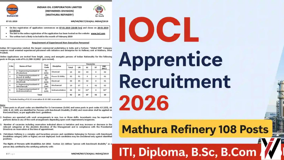 इस लेख में आपको IOCL Mathura Refinery भर्ती 2026 से जुड़ी पूरी जानकारी मिलेगी — पात्रता, पद विवरण, वेतन संरचना, चयन प्रक्रिया, आवेदन तिथि और तैयारी रणनीति।