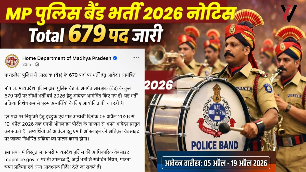 MP Police Band Bharti 2026 संगीत प्रेमी युवाओं के लिए एक अनूठा अवसर है। यह केवल एक नौकरी नहीं है, बल्कि सम्मान, वर्दी और कला का अद्भुत संगम है। जैसे ही आवेदन प्रक्रिया शुरू हो, तुरंत ऑनलाइन आवेदन करें और शारीरिक एवं बैंड परीक्षा की तैयारी में जुट जाएँ। इस लेख में दी गई सभी जानकारी को ध्यानपूर्वक पढ़ें और सरकारी वेबसाइट से आधिकारिक नोटिफिकेशन भी डाउनलोड कर लें।