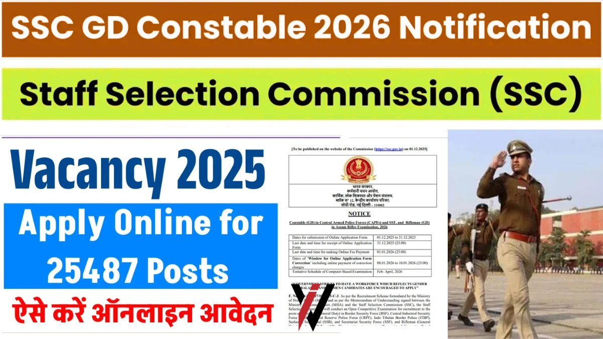 कर्मचारी चयन आयोग (SSC) ने सीमा सुरक्षा बल (BSF), केंद्रीय औद्योगिक सुरक्षा बल (CISF), केंद्रीय रिजर्व पुलिस बल (CRPF) जैसी केंद्रीय सशस्त्र पुलिस बलों (CAPFs) में सामान्य ड्यूटी कांस्टेबल (Constable GD) के 25,487 रिक्त पदों पर भर्ती के लिए अधिसूचना जारी की है। यह भर्ती मुख्य रूप से 10वीं पास युवाओं के लिए एक शानदार अवसर प्रदान करती है। ऑनलाइन आवेदन की प्रक्रिया 1 दिसंबर 2025 से शुरू हो चुकी है और यह 31 दिसंबर 2025 तक चलेगी।